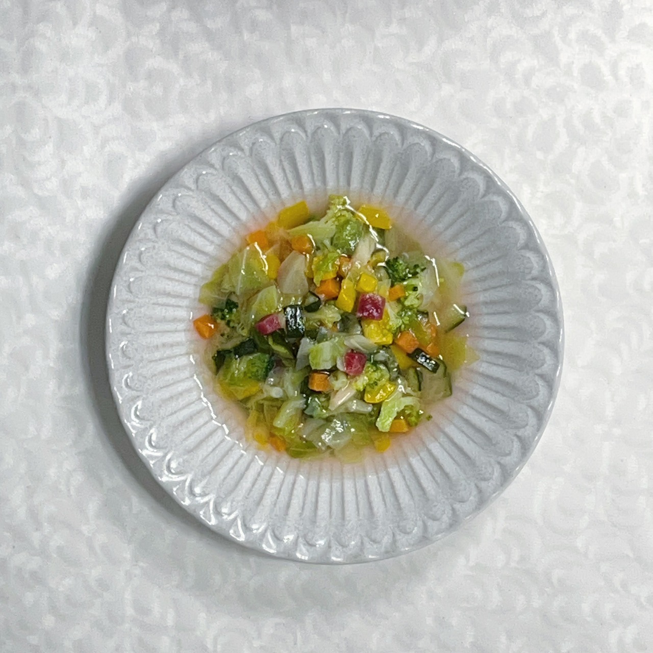 チキンブロスもしくは黄金だし(鰹節、煮干、昆布、椎茸、あじ)/野菜の種類によって変動。