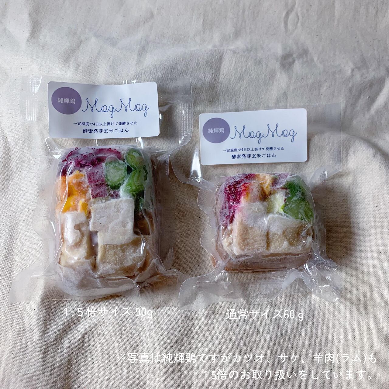 人気の酵素発芽玄米ごはんに、1.5倍の内容量と具材が増えたBIGサイズが加わりました。食べ応えのあるサイズで3kg前後のワンちゃんには1キューブで約1食分になります。忙しい日でも、自然解凍するだけで簡単に与えられる手作りごはんです。